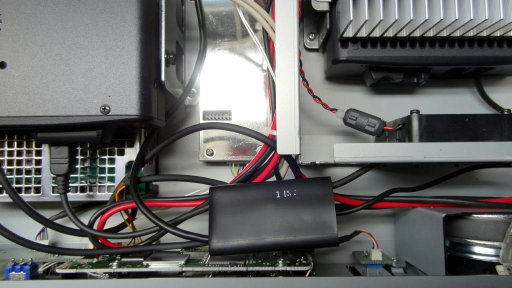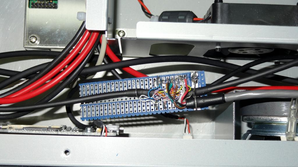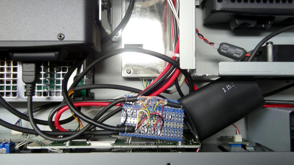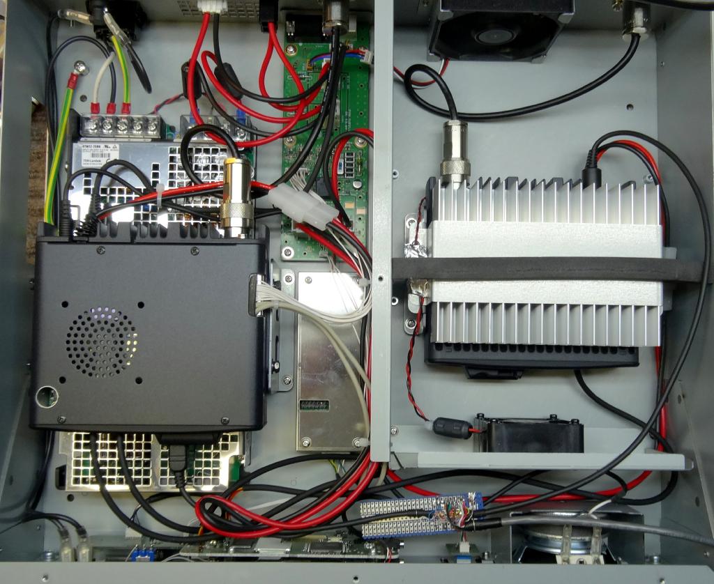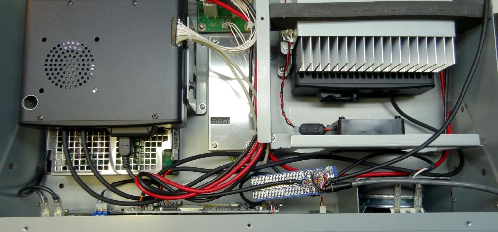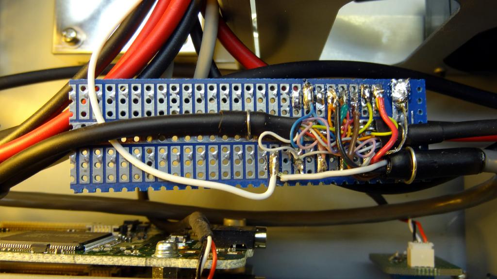 View of the board installed in the DR1 with cables not yet cleanly routed and tied.