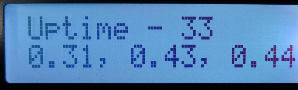 Here I show date and time, canned text, and display of system parameters. The final being uptime and load averages. This also shows the ability to change the backlight to any color. Here I show pure red, Green (pure blue has poor contrast), and off white but you can define any color in RGB values.