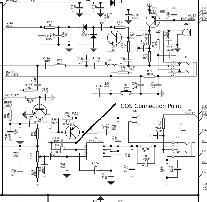 For those wishing to see where the COS connection is in the radio here is a portion of the schematic that shows the connection. It is connected at the collector of Q19. This results in a low going level on RX at the drain output of the 2N7000 FET. This is desireable as this allows the use of cosfrom=usbinvert (carrierfrom=usbinvert) in simpleusb.conf.