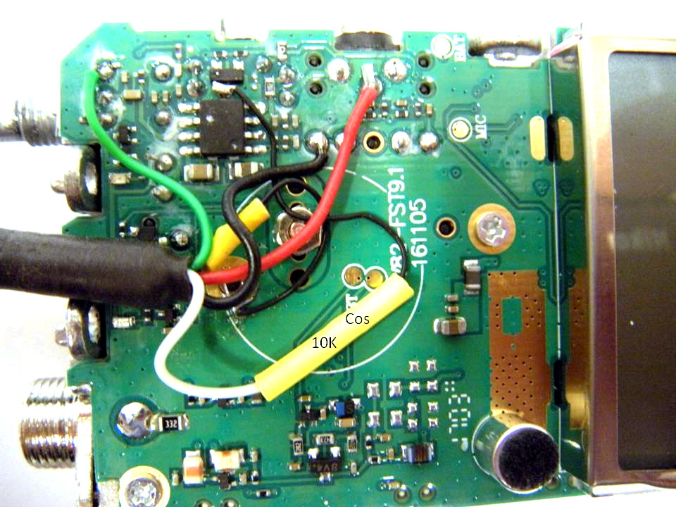 and the wires after connection. Note the COS line is fed through a 10K resistor located in the yellow heatshrink. This can be a 1/4 or preferably a 1/8W resistor. Wire colors are not important as long as you standardize at both ends. Shown here the Red is PTT, Green is RX audio, Black is TX audio, White is COS with small black on the other side of the resistor to the board, and the small black is ground.