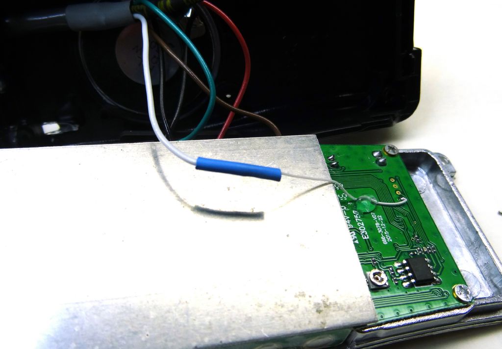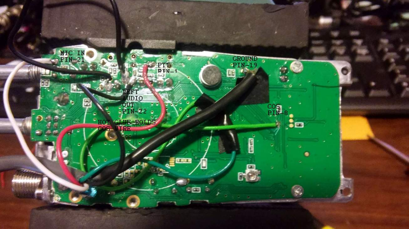 Completed modification. Note the wire is dressed down the radio and wire tied AWAY from the antenna. Prior to doing that motor-boating appeared on TX. Routing the leads properly should eliminate any need for bypassing. Also in a portable node it might be best to remote the antenna away from the other electronics.