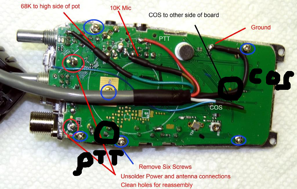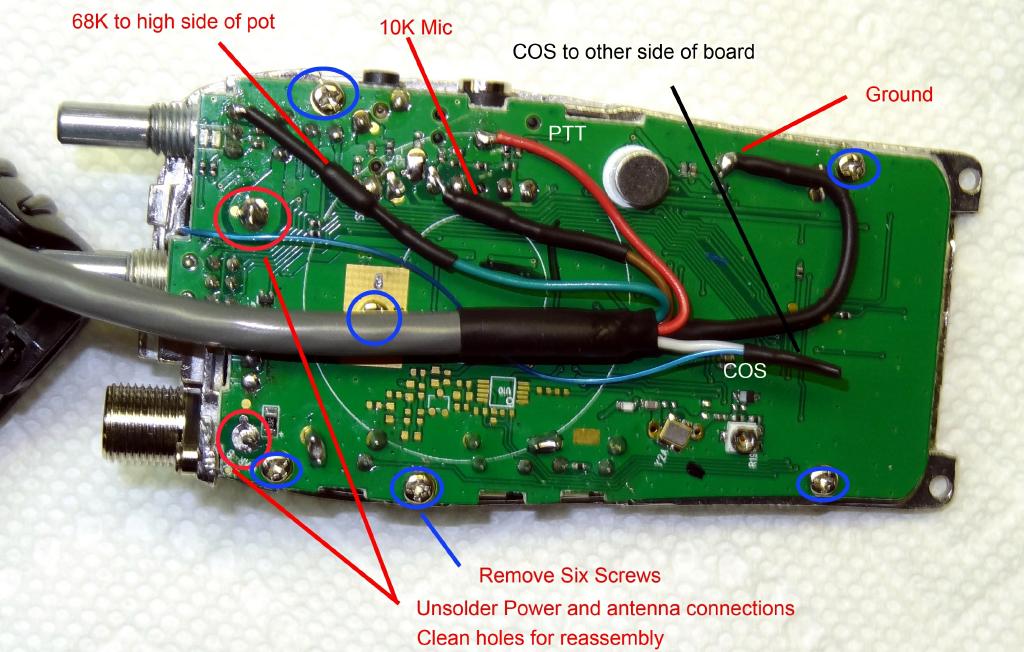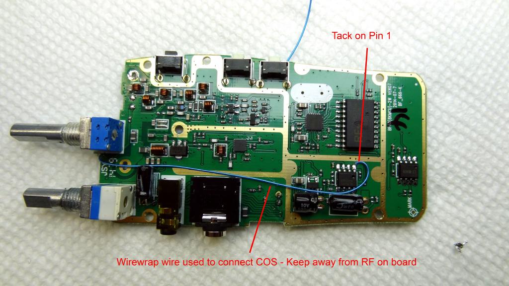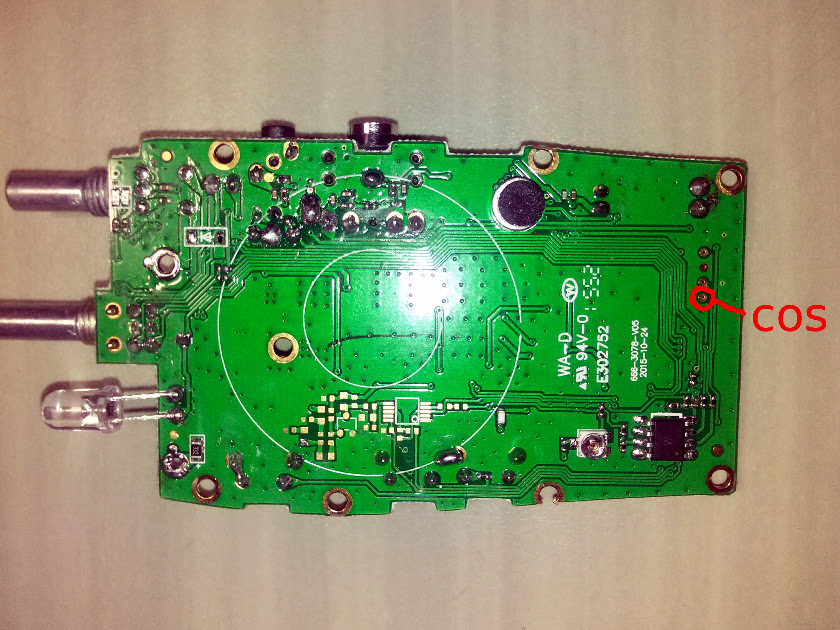 Frits, W1FVB forwarded to me this photo showing an easier way to pickup the COS line. NO disassembly of the circuit board is needed! No screw removal or unsoldering! Disregard those instructions and make all the connections on the solder side of the board. See the photo below for the connection point. The white wire shown connected to the smaller blue wire to the other side of the board instead simply connects to the point shown in the circle labelled COS.