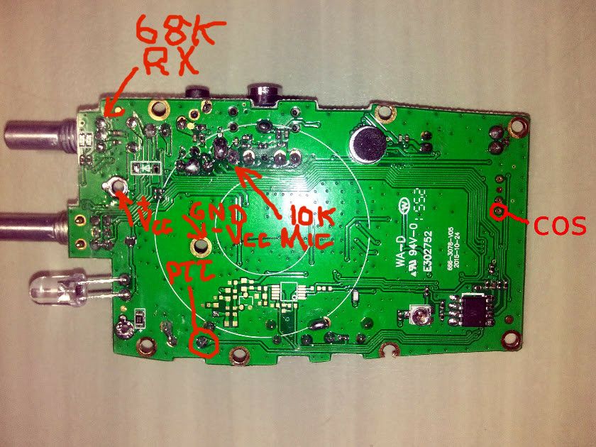 The only difference between this modification and others I have seen is that I do not remove anything from the transceiver except the LED. The LED is removed to facilitate the use of its opening in the case for the wire to the URI. In addition the RX audio wire is connected to the hight side of the pot. The side closest to the board edge. It is a much better idea to not connect at the speaker where more distortion and also level changes by the volume pot could take place. The value of the resistor is changed to 68K from the high side of the pot to the URI. The speaker works normally with the volume control and you can monitor incoming traffic on the node. The mic is muted by inserting an unconnected miniature (stereo, 3 conductor NOT 2 conductor) phone plug (larger plug) into the side of the radio. The rest of the photos should be self explanatory.