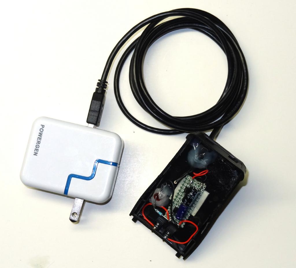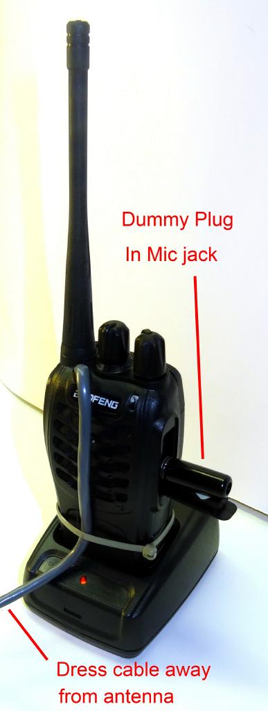 Some additional suggestions - A 5V 2A wall wart with 2 diodes in series on the + lead works well as a power supply. This gives you a voltage close to the 3.7 volt battery. Also many of you probably have several old USB cables laying around. They make good connection cables for the audio, PTT, and COS lines from the radio to the FOB. They are well shielded. Cut off the ends and you have the required 4 wires and a shield. Also a user has installed the resistors at the connector end of the cable rather than inside the radio with success so this is also an option.
