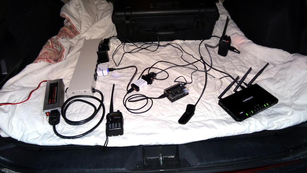 The next two photos show the installation in the back of my Subaru Outback. Power came from an inverter and outlet strip with two 5V wall warts for the radio and BBB and a 12V wall wart for the Cradlepoint. There is very minimal current draw from the battery. If one were to install this in a car or truck you would probably want to run it from a small battery that in turn was charged from the car. That way there would be no interruptions when the car was switched off and it would be well isolated from the cars power. A 12 Volt gel cell could probably run it all day. You could drive to work and have a node running outside in your car!