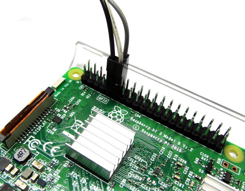 The circuit is rather simple and could be fabricated on a perf board as shown above. We are looking into making a PC board which would make it easier to assemble. Using the printed circuit approach the board could also be make smaller. There are three wires to the Pi. Make sure these are connected on the right pins. A detailed photo is shown below. The ground pin (black in this case) is connected to pin 9, the 5th pin from the SD card end toward the inside of the board. The power good pin (white) is connected to pin 11 (GPIO0) the next pin. The shutdown wire (gray) is connected to pin 12 (GPIO1) adjacent to pin 11. See the schematic link below.