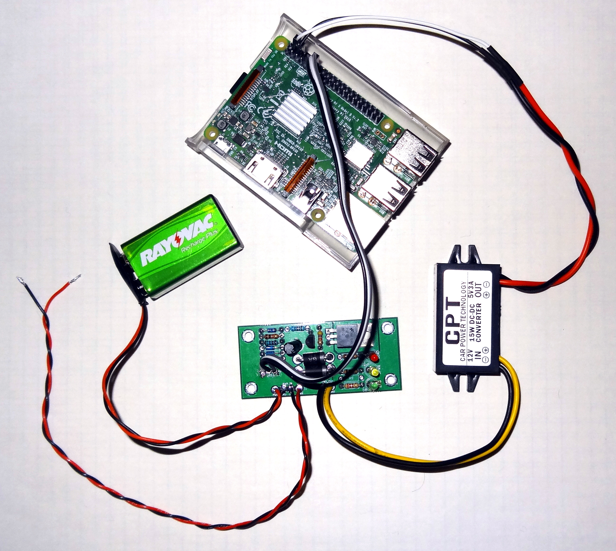 So what if you don't want to connect the node to always on power and you do not want to physically throw a switch to power down your node? In this case the node would be connected to switched power which is usually always the case when powering from a "cigarette plug" connection in a car. In this case some means of powering the system is required for the short shutdown period. Depending on the power requirements of the radio the power switching (MOSFET or relay and Schottky diodes) need to be sized accordingly. For this article we will assume a low power (~1W) node radio like a Baofeng 888 or UV82 in low power and the Pi. When the user turns on the car the radio and Pi receive power, the Pi boots and sets a bit to keep the power on. It then monitors the power good bit and when the power to the node is removed (the car is turned off) the shutdown is initiated after a short delay, the user is informed and all power is shut off. The amount of time the battery is required to supply power is about 10 seconds during this shutdown period. In our tests using the Baofeng 888 in a node where two high efficiency supplies provide power to the Pi (5V) and the 888 (3.7V) a 9 volt NiMH rechargeable battery seems to work fine. The batter is trickle charged during the powered period.